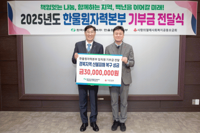 [NWS¹æ¼Û=Çѽ¸ñ ±âÀÚ]Çѱ¹¼ö·Â¿øÀÚ·Â(ÁÖ) ÇÑ¿ï¿øÀڷº»ºÎ´Â ¿µ´öÁö¿ª »êºÒÇÇÇØ º¹±¸¸¦ À§ÇØ Áö¼ÓÀûÀ¸·Î ºÀ»çȰµ¿À» ½ÃÇà ÁßÀ̸ç, ÃÑ 3õ¸¸ ¿øÀÇ ¼º±ÝÀ» »ç¶ûÀÇ¿­¸Å °æºÏ»çȸº¹Áö°øµ¿¸ð±Ýȸ¿¡ Àü´ÞÇß´Ù. À̹ø ¼º±ÝÀº ÇѿﺻºÎ Á÷¿øµéÀÌ ¡¦