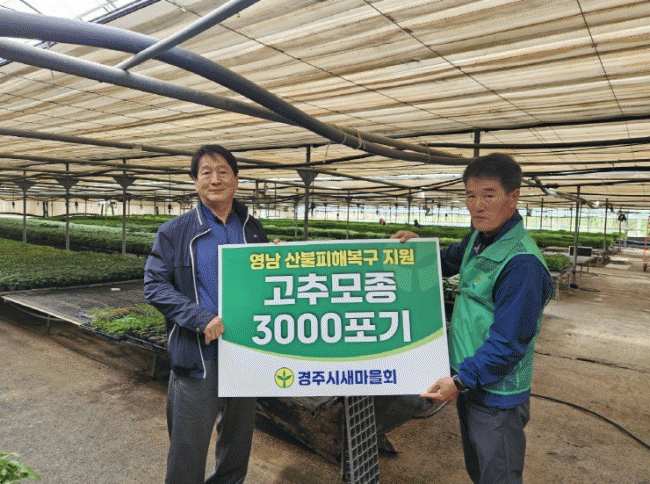[NWS¹æ¼Û=Çѽ¸ñ ±âÀÚ]°æÁֽûõ¸¶À»È¸´Â 4¿ù 23ÀÏ »êºÒ·Î ÇÇÇØ¸¦ ÀÔÀº ¾Èµ¿½Ã ³ó°¡ Áö¿øÀ» Çϱâ À§ÇØ °íÃß ¸ðÁ¾ 3,000Æ÷±â¸¦ ¾Èµ¿½Ã»õ¸¶À»È¸¿¡ Àü´ÞÇß´Ù. ¹ÚÁ¤¿ø ȸÀåÀº¡°3,000 Æ÷±â °íÃß ¸ðÁ¾ÀÌ À̹ø »êºÒ·Î ÇÇÇØ¹ÞÀº ³ó°¡¿¡ Á¶±ÝÀ̳ª¸¶¡¦