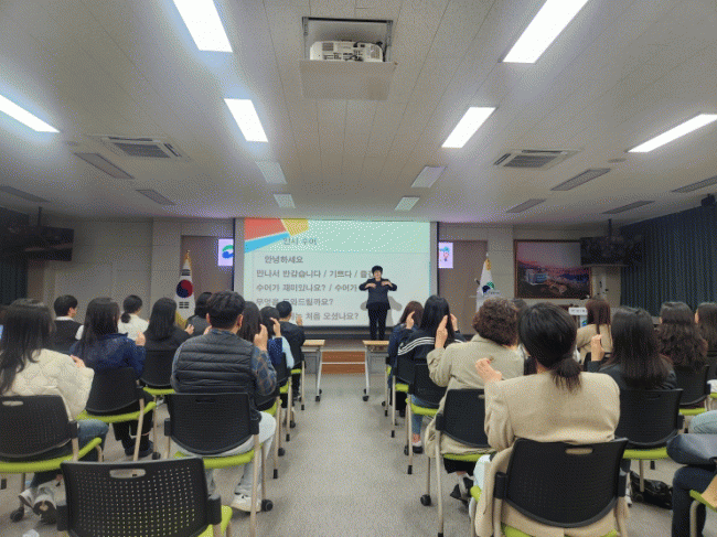 [NWS¹æ¼Û=Çѽ¸ñ ±âÀÚ]ºÎ»ê±¤¿ª½Ã ¼­±¸´Â Áö³­ 17ÀÏ ÇöÀå ¹Î¿ø ¾÷¹« Á÷¿ø 65¸íÀ» ´ë»óÀ¸·Î '¼Õ³¡À¸·Î ÀüÇÏ´Â ¹Î¿ø ¼­ºñ½º, Á÷¿ø ¼ö¾î ±³À°'À» ½Ç½ÃÇß´Ù. À̳¯¿¡´Â °­Çö¼ø ¼­±¸ ¼ö¾î Å뿪¼¾ÅÍ ½ÇÀåÀ» °­»ç·Î ¸ð¼Å ¹Î¿ø ¾÷¹«ÀÇ ÇöÀå¿¡ Çʿ䡦