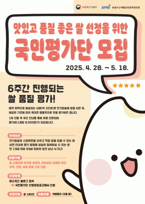 [NWS¹æ¼Û=Çѽ¸ñ ±âÀÚ] ³ó¸²Ãà»ê½ÄǰºÎ´Â ¿ì¸®³ª¶ó ÁÖ¿ä ½Ò Ç°Á¾ÀÇ ¹ä¸ÀÀ» Æò°¡ÇÒ ±¹¹ÎÆò°¡´Ü 180¸íÀ» ¿À´Â 4¿ù 28ÀϺÎÅÍ 5¿ù 18ÀϱîÁö 3ÁÖ°£ ¸ðÁýÇÑ´Ù°í ¹àÇû´Ù. À̹ø¿¡ ¸ðÁýÇÏ´Â 180¸íÀÇ ±¹¹ÎÆò°¡´ÜÀº ³óÃÌÁøÈïû, ±¹¸³Á¾ÀÚ¿ø, ÁöÀÚ¡¦