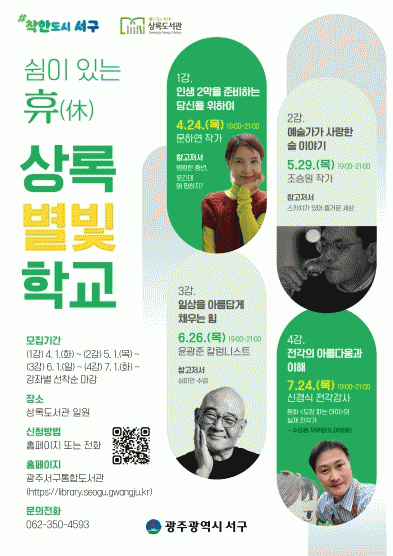 [NWS¹æ¼Û=Çѽ¸ñ ±âÀÚ]±¤ÁÖ±¤¿ª½Ã ¼­±¸°¡ Áö¿ª Áֹο¡°Ô ´Ù¾çÇÑ ¹®È­¸¦ Á¢ÇÒ ¼ö ÀÖ´Â ±âȸ Á¦°ø°ú ±³¾ç ÇÔ¾çÀ» À§ÇÑ Àι®¡¤¿¹¼ú ¾ß°£ Ư°­ »ó·Ïº°ºûÇб³¸¦ ¿î¿µÇÑ´Ù. À̹ø Ư°­Àº ¿À´Â 7¿ù±îÁö ¸Å¿ù ¸¶Áö¸· ÁÖ ¸ñ¿äÀÏ ¿ÀÈÄ 7½Ã¿¡ ÁøÇàµÇ¡¦