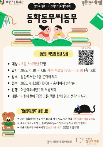 [»çȸ] ºÎÆò±¸¸³°¥»êµµ¼­°ü, ÃʵîÇб³ 3~6Çг⠴ë»ó µ¶¼­ ÇÁ·Î±×·¥ ¡®µ¿È­µ¿¹«¾¾µ¿¹«¡¯ ¿î¿µ |2025. 04.23