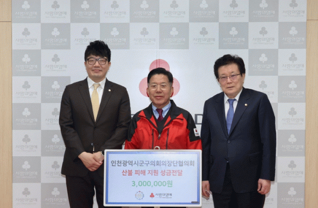 [NWS¹æ¼Û=Çѽ¸ñ ±âÀÚ]ÀÎõ±¤¿ª½Ã±º±¸ÀÇȸÀÇÀåÇùÀÇȸ´Â Áö³­ 22ÀÏ, »çȸº¹Áö°øµ¿¸ð±Ýȸ¸¦ ÅëÇØ ¿µ³²Áö¿ª »êºÒ ÇÇÇØ Áö¿øÀ» À§ÇÑ ¼º±Ý 300¸¸¿øÀ» ±âŹÇß´Ù. ±âŹ½Ä¿¡´Â ÀÌÀǸí ÇùÀÇȸÀå, ¼Û½Âȯ »ç¹«ÃÑÀåÀÌ Âü¼®ÇßÀ¸¸ç Àü°æ¾Ö ºÎȸÀå, ÀÌ¡¦