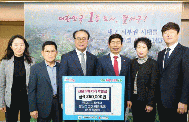 [NWS¹æ¼Û=Çѽ¸ñ ±âÀÚ] ´ë±¸ ´Þ¼­±¸´Â Çѱ¹ÀÚÀ¯ÃÑ¿¬¸Í ´Þ¼­±¸Áöȸ·ÎºÎÅÍ »êºÒ ÇÇÇØ Áö¿ª Áö¿øÀ» À§ÇÑ ÈÄ¿ø±Ý 326¸¸¿øÀ» ±âŹ¹Þ¾Ò´Ù°í 23ÀÏ ¹àÇû´Ù. Çѱ¹ÀÚÀ¯ÃÑ¿¬¸ÍÀº ±¹°¡ ¾Èº¸ÀÇ½Ä ÇÔ¾ç, ±¹¹Î È­ÇÕ, »çȸºÀ»ç, ȯ°æÁ¤È­ µî ´Ù¾çÇÑ »ç¡¦
