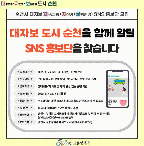 [NWS¹æ¼Û=Çѽ¸ñ ±âÀÚ]¼øÃµ½Ã´Â ´ëÁß±³Åë°ú ÀÚÀü°Å, º¸Çàȯ°æ µî ÁÖ¿ä Á¤Ã¥ÀÇ È«º¸¸¦ À§ÇÑ ¡®2025³â ´ëÀÚº¸ SNS È«º¸´Ü¡¯À» ¿À´Â 30ÀϱîÁö ¸ðÁýÇÑ´Ù°í ¹àÇû´Ù. È«º¸´ÜÀº 5¿ùºÎÅÍ 10¿ù±îÁö 5°³¿ù°£ ¿î¿µµÈ´Ù. ¡â´ëÁß±³Åë+º¸Çà ¡âÀÚÀü°Å¡¦