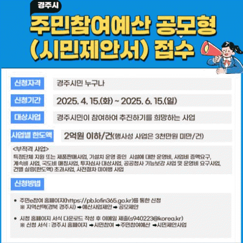 [»çȸ] °æÁÖ½Ã, 2026³â ÁÖ¹ÎÂü¿©¿¹»ê ½Ã¹Î °ø¸ð»ç¾÷ Á¢¼ö ½ÃÀÛ |2025. 04.23