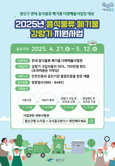[»çȸ] ±¤ÁÖ±¤¿ª½Ã ±¤»ê±¸, À½½Ä¹°¾²·¹±â ´Ù·®¹èÃâ»ç¾÷Àå °¨·®±â ¼³Ä¡ Áö¿ø |2025. 04.23
