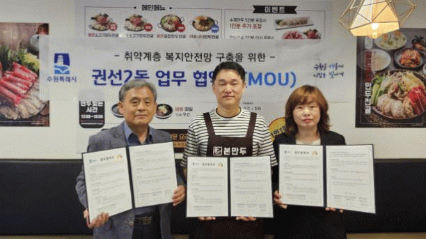 [NWS¹æ¼Û=Çѽ¸ñ ±âÀÚ]¼ö¿ø½Ã ±Ç¼±±¸ ±Ç¼±2µ¿ ÇàÁ¤º¹Áö¼¾ÅÍ´Â Áö³­ 22ÀÏ, ±Ç¼±2µ¿ Áö¿ª»çȸº¸ÀåÇùÀÇü, º»¸¸µÎ ±Ç¼±Á¡¿Í ÇÔ²² º¹Áö»ç°¢Áö´ë Ãë¾à°èÃþ À½½Ä ÈÄ¿øÀ» À§ÇÑ ¾÷¹«Çù¾àÀ» ü°áÇß´Ù. À̹ø Çù¾àÀ» ÅëÇØ ±Ç¼±2µ¿ ÇàÁ¤º¹Áö¼¾ÅÍ¿Í ¡¦