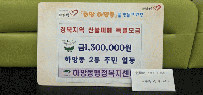 [NWS¹æ¼Û=Çѽ¸ñ ±âÀÚ]¿µÁֽà ÇϸÁµ¿Àº Áö³­ 22ÀÏ, ÇϸÁµ¿ 2Åë ÁֹεéÀÌ °æºÏÁö¿ª »êºÒÇÇÇØ ÀÌÀç¹ÎÀ» µ½±â À§ÇØ ¼º±Ý 130¸¸ ¿øÀ» ±âŹÇÏ¸ç µû¶æÇÑ ³ª´®À» ½ÇõÇß´Ù°í ¹àÇû´Ù. À̹ø ¼º±ÝÀº ÇϸÁµ¿ 2Åë ÁֹεéÀÌ ÀÚ¹ßÀûÀ¸·Î ¸ð±ÝÇØ ¸¶·ÃÇÑ¡¦