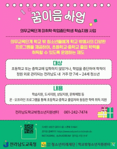 [NWS¹æ¼Û=Çѽ¸ñ ±âÀÚ] (Àç)Àü¶ó³²µµÃ»¼Ò³â¹Ì·¡Àç´Ü Çб³¹Ûû¼Ò³âÁö¿ø¼¾ÅÍ´Â 2025³â 3¿ùºÎÅÍ µµ³» Çб³ ¹Û û¼Ò³âÀ» ´ë»óÀ¸·Î ¡®Àǹ«±³À°´Ü°è ¹ÌÃëÇС¤Çо÷Áß´ÜÇлý ÇнÀÁö¿ø »ç¾÷(²ÞÀÌÀ½)¡¯À» ¿î¿µÇϰí ÀÖ´Ù. ¡®²ÞÀÌÀ½¡¯Àº ±³À°ºÎ, ¡¦