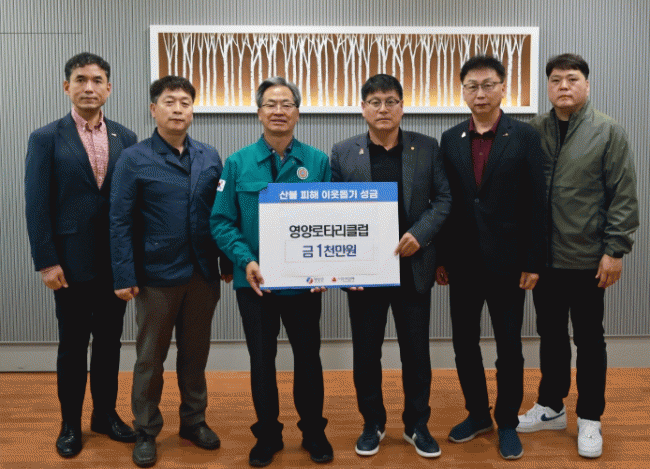 [NWS¹æ¼Û=Çѽ¸ñ ±âÀÚ]±¹Á¦·ÎŸ¸® 3630Áö±¸ ¿µ¾ç·ÎŸ¸®Å¬·´(ȸÀå ±èÁ¾È£)Àº ÃÖ±Ù ¹ß»ýÇÑ »êºÒ·Î Å« ÇÇÇØ¸¦ ÀÔÀº ¿µ¾ç±º Áö¿ª ÁֹεéÀ» Áö¿øÇϱâ À§ÇØ ¼º±Ý 1,000¸¸¿øÀ» ¿µ¾ç±ºÃ»¿¡ Àü´ÞÇß´Ù. À̹ø ¼º±ÝÀº »êºÒ ÇÇÇØ·Î ¾î·Á¿òÀ» °Þ°í ÀÖ¡¦