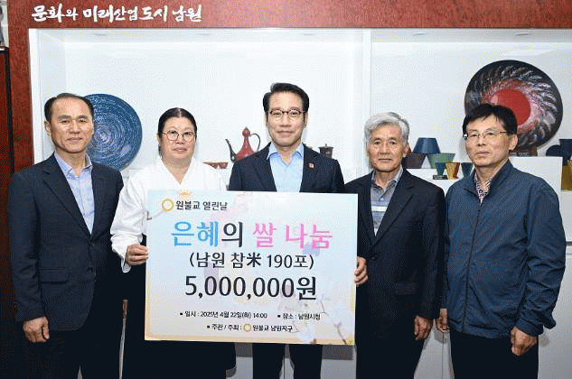 [NWS¹æ¼Û=Çѽ¸ñ ±âÀÚ]¿øºÒ±³ ³²¿øÁö±¸´Â ¿ø±â109³â 4¿ù 28ÀÏ ¿øºÒ±³ ¿­¸°³¯(´ë°¢°³±³Àý)À» ±â³äÇÏ¿© ¡°ÀºÇýÀÇ ½Ò ³ª´©±â Çà»ç¡±¸¦ ¿­°í ³²¿ø Âü¹Ì 10kg 190Æ÷(ȯ°¡¾× 500¸¸¿ø)¸¦ ³²¿ø½Ã¿¡ ±âºÎÇß´Ù. ¿øºÒ±³ ³²¿øÁö±¸´Â ¸Å³â ´ë°¢°³±³Àý¡¦