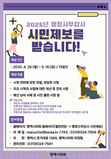[NWS¹æ¼Û=Çѽ¸ñ ±âÀÚ]ÆòÅýÃÀÇȸ´Â 2025³âµµ ÇàÁ¤»ç¹«°¨»ç¿¡ ¾Õ¼­ 4¿ù 28ÀϺÎÅÍ 5¿ù 16ÀϱîÁö 19Àϰ£ ½Ã¹Î Á¦º¸¸¦ ¹Þ´Â´Ù. 2025³â ÇàÁ¤»ç¹«°¨»ç´Â Á¦256ȸ Á¦1Â÷ Á¤·Êȸ ±â°£ Áß 6¿ù 20ÀϺÎÅÍ 6¿ù 27ÀϱîÁö 8Àϰ£ ÁøÇàµÉ ¿¹Á¤À̸ç, ½Ã¡¦