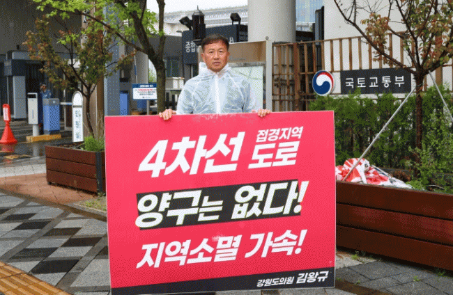 [NWS¹æ¼Û=Çѽ¸ñ ±âÀÚ] °­¿øÆ¯º°ÀÚÄ¡µµÀÇȸ ±è¿Õ±Ô ÀÇ¿øÀº 22ÀÏ ¼¼Á¾½Ã Á¤ºÎû»ç ¾Õ¿¡¼­ Á¢°æÁö¿ªÀÇ ¿­¾ÇÇÑ µµ·Î »çÁ¤°ú »çȸ±â¹Ý½Ã¼³(SOC) È®ÃæÀÇ Çʿ伺À» ¾Ë¸®±â À§ÇÑ 1ÀÎ ½ÃÀ§¸¦ ÁøÇàÇß´Ù. À̹ø ½ÃÀ§´Â Áö¿ªÀ» °æÀ¯ÇÏ´Â °í¼Óµµ·Î¡¦