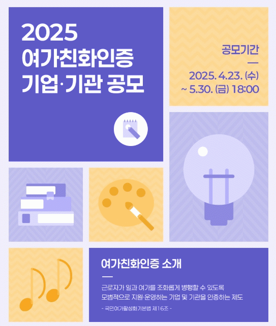 [NWS¹æ¼Û=Çѽ¸ñ ±âÀÚ]¹®È­Ã¼À°°ü±¤ºÎ´Â Áö¿ª¹®È­ÁøÈï¿ø°ú ÇÔ²² 4¿ù 23ÀϺÎÅÍ 5¿ù 30ÀϱîÁö ±Ù·ÎÀÚµéÀÇ ¡®Àϰú ¿©°¡ÀÇ ±ÕÇü¡¯À» Áö¿øÇÏ´Â ±â¾÷¡¤±â°üÀ» ´ë»óÀ¸·Î ¡®2025 ¿©°¡Ä£È­ÀÎÁõ¡¯ ½ÅûÀ» ¹Þ´Â´Ù. ¿©°¡Ä£È­ÀÎÁõÁ¦´Â '±¹¹Î¿©°¡È°¼º¡¦
