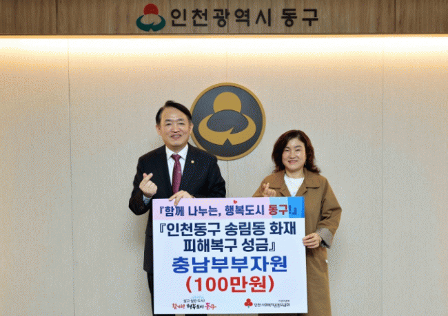 [NWS¹æ¼Û=Çѽ¸ñ ±âÀÚ]ÀÎõ µ¿±¸´Â Áö³­ 17ÀÏ Ãæ³²ºÎºÎÀÚ¿ø(´ëÇ¥ °í¹Ì¼÷, Á¶Èñ»ó)ÀÌ ¼Û¸²µ¿ È­Àç ÇÇÇØ º¹±¸¸¦ À§ÇØ ¼º±Ý 100¸¸¿øÀ» ±âŹÇß´Ù°í ¹àÇû´Ù. Ãæ³²ºÎºÎÀÚ¿øÀÌ ±âŹÇÑ ¼º±ÝÀº ÀÎõ»çȸº¹Áö°øµ¿¸ð±Ýȸ¿¡ Àü´ÞµÆ´Ù. ¼º±ÝÀº ÇâÈÄ¡¦