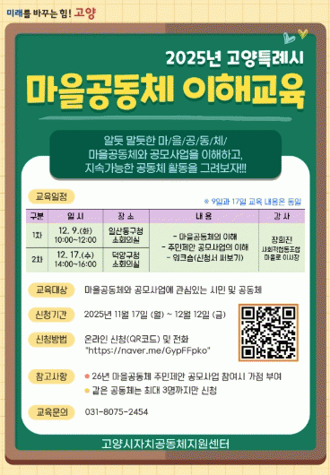 [NWS¹æ¼Û=Çѽ¸ñ ±âÀÚ]°í¾çƯ·Ê½Ã´Â ½Ã¹ÎµéÀÇ ¸¶À»°øµ¿Ã¼ Ȱµ¿¿¡ ´ëÇÑ ÀÌÇØµµ¿Í Âü¿©¸¦ ³ôÀ̱â À§ÇØ ¿À´Â 12¿ù 9Àϰú 17ÀÏ, µÎ Â÷·Ê¿¡ °ÉÃÄ ¡®2025³â ¸¶À»°øµ¿Ã¼ ÀÌÇØ±³À°¡¯À» ÁøÇàÇÑ´Ù°í ¹àÇû´Ù. À̹ø ±³À°Àº ¿ÃÇØ óÀ½ ½ÃÇàµÇ´Â ÇÁ·Î¡¦