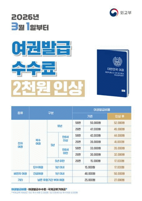 [NWS¹æ¼Û=Çѽ¸ñ ±âÀÚ]¿À»ê½Ã´Â ¿À´Â 3¿ù 1ÀϺÎÅÍ ¿©±Ç ¹ß±Þ ¼ö¼ö·á°¡ 2õ ¿ø ÀλóµÈ´Ù°í 20ÀÏ ¹àÇû´Ù. ÀÌ´Â ¿Ü±³ºÎÀÇ ¿©±Ç¹ý ½ÃÇà·É °³Á¤¿¡ µû¸¥ Á¶Ä¡·Î, À¯È¿±â°£ 10³â º¹¼ö¿©±Ç ±âÁØ 58¸éÀº ±âÁ¸ 5¸¸ ¿ø¿¡¼­ 5¸¸ 2õ ¿øÀ¸·Î, 26¸éÀº ¡¦