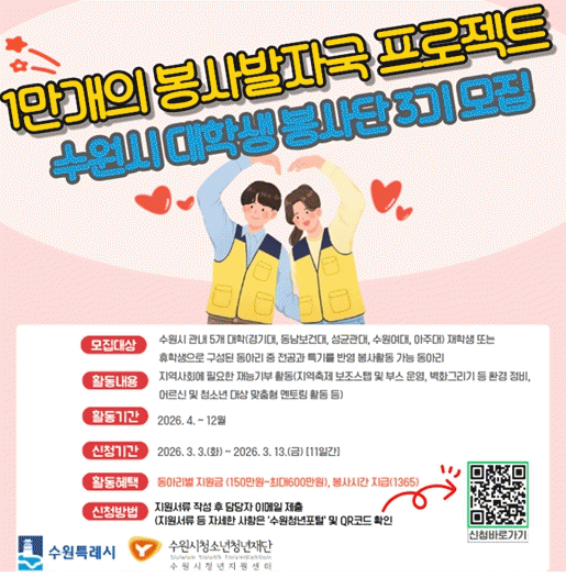 [NWS¹æ¼Û=Çѽ¸ñ ±âÀÚ]¼ö¿ø½Ãû¼Ò³âû³âÀç´Ü ¼ö¿ø½Ãû³âÁö¿ø¼¾ÅÍ´Â 3¿ù 3ÀϺÎÅÍ 3¿ù 13ÀϱîÁö Áö¿ª»çȸ ºÀ»ç ¹®È­¸¦ È®»êÇÏ°í ´ëÇлýµéÀÇ »çȸ°øÇå Ȱµ¿À» Áö¿øÇϱâ À§ÇÑ '1¸¸ °³ÀÇ ºÀ»ç¹ßÀÚ±¹' Âü¿© µ¿¾Æ¸®¸¦ ¸ðÁýÇÑ´Ù. ¿ÃÇØ·Î 3³â Â÷¸¦¡¦