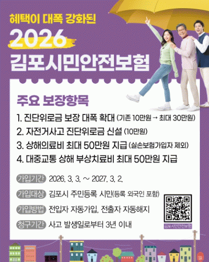 [NWS¹æ¼Û=Çѽ¸ñ ±âÀÚ]±èÆ÷½Ã´Â 3¿ù 3ÀϺÎÅÍ ½Ã¹ÎµéÀÌ ÀÏ»ó»ýȰ Áß °ÞÀ» ¼ö ÀÖ´Â ºÒÀÇÀÇ »ç°í¿¡ ´ëºñÇØ º¸Àå Ç׸ñÀ» °­È­ÇÑ ¡®2026³â ±èÆ÷½Ã¹Î¾ÈÀüº¸Ç衯À» ½ÃÇàÇÑ´Ù°í ¹àÇû´Ù. ±èÆ÷½Ã¹Î¾ÈÀüº¸ÇèÀº µî·Ï ¿Ü±¹ÀÎÀ» Æ÷ÇÔÇØ ±èÆ÷½Ã¿¡ ÁÖ¼ÒÁö¡¦