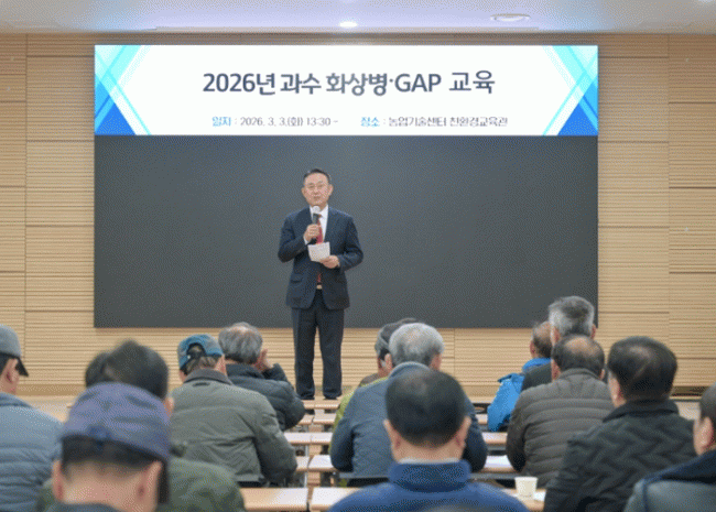 [NWS¹æ¼Û=Çѽ¸ñ ±âÀÚ]¿©Áֽô Áö³­ 3ÀÏ ³ó¾÷±â¼ú¼¾ÅÍ¿¡¼­ °ü³» »ç°ú¡¤¹è Àç¹è ³ó°¡¸¦ ´ë»óÀ¸·Î ¡®°ú¼öÈ­»óº´ ¿¹¹æ ±³À°¡¯À» ½Ç½ÃÇß´Ù°í ¹àÇû´Ù. À̹ø ±³À°Àº °ú¼öÈ­»óº´ÀÇ Áö¿ª À¯ÀÔÀ» Â÷´ÜÇÏ°í ³ó°¡ÀÇ ÀÚ°¡ ´ëÀÀ ´É·ÂÀ» ³ôÀ̱â À§ÇØ¡¦