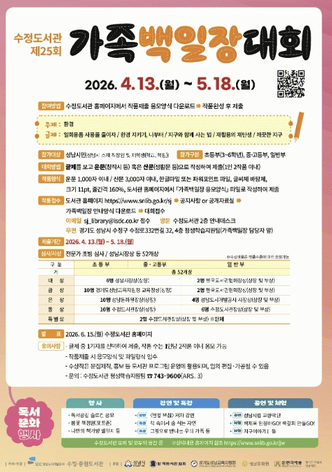 [NWS¹æ¼Û=Çѽ¸ñ ±âÀÚ]¼º³²µµ½Ã°³¹ß°ø»ç ¼öÁ¤µµ¼­°üÀº °¡Á· ´ÜÀ§ µ¶¼­¹®È­ ÁøÈï°ú ȯ°æ¿¡ ´ëÇÑ ½Ã¹ÎÀÇ °ü½ÉÀ» ³ôÀ̰íÀÚ ¡®Á¦25ȸ °¡Á·¹éÀÏÀ塯À» °³ÃÖÇÑ´Ù°í 13ÀÏ ¹àÇû´Ù. ¿ÃÇØ·Î 25ȸ¸¦ ¸ÂÀº °¡Á·¹éÀÏÀåÀº ¡®È¯°æ¡¯À» ÁÖÁ¦·Î ÁøÇàµÈ´Ù.¡¦