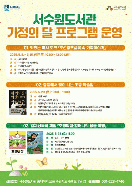 [»çȸ] ¼­¼ö¿øµµ¼­°ü, 5¿ù °¡Á¤ÀÇ ´Þ µ¶¼­¹®È­ ÇÁ·Î±×·¥ Âü¿©ÀÚ ¸ðÁý |2025. 04.22