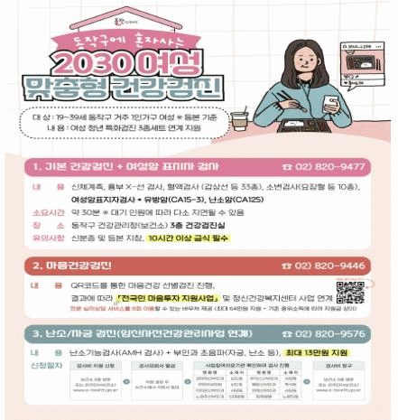 [NWS¹æ¼Û=Çѽ¸ñ ±âÀÚ]µ¿ÀÛ±¸°¡ °Ç°­ °ü¸®¿¡ ¼ÒÈ¦ÇØÁö±â ½¬¿î °ü³» 19~39¼¼ ¿©¼º 1ÀÎ °¡±¸¸¦ ´ë»óÀ¸·Î ¸ÂÃãÇü °Ç°­°ËÁøÀ» Á¦°øÇÑ´Ù. ±¸´Â ÀÌ´ÞºÎÅÍ Ã»³â ¿©¼º¿¡°Ô ƯȭµÈ ¡ã°Ç°­°ËÁø ¡ã¸¶À½ °Ç°­ ¼±º° °Ë»ç ¡ã³­¼Ò ±â´É °Ë»ç ¹× ³­¼Ò¡¤ÀÚ¡¦