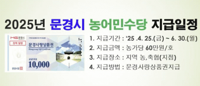 [»çȸ] ¹®°æ½Ã, 2025³â ³ó¾î¹Î¼ö´ç 60¸¸ ¿ø¾¿ ³ó°¡¿¡ Áö±Þ |2025. 04.22