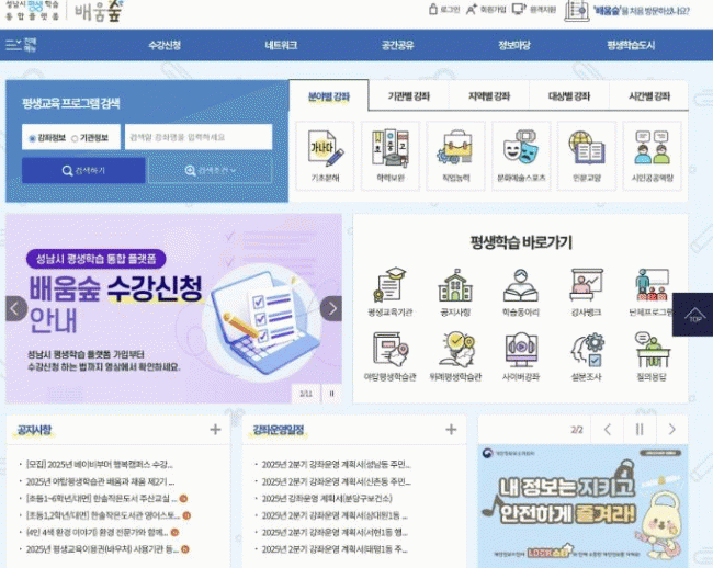 [NWS¹æ¼Û=Çѽ¸ñ ±âÀÚ]¼º³²½Ã´Â »êÀçµÇ¾î ÀÖ´Â Æò»ý±³À° Á¤º¸¸¦ ÅëÇÕÇØ Á¦°øÇÏ´Â Æò»ýÇнÀ ÅëÇÕÇ÷§Æû ¡®¹è¿ò½£¡¯ ȨÆäÀÌÁö¸¦ ¿î¿µÇϰí ÀÖ´Ù. ÀÌ Ç÷§ÆûÀ» ÅëÇØ ½Ã¹ÎµéÀº °­Á ¼ö°­½Åû, °áÁ¦ µîÀ» ¼Õ½±°Ô Çϰí, ±â°ü ¿î¿µÀÚ´Â Ãâ°á°ü¸®,¡¦