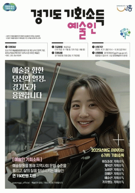 [NWS¹æ¼Û=Çѽ¸ñ ±âÀÚ]½ÃÈï½Ã´Â °æ±âµµ¿Í °øµ¿À¸·Î ÃßÁøÇÏ´Â ¡®2025 ¿¹¼úÀÎ ±âȸ¼Òµæ¡¯ÀÇ »ç¾÷ ½ÅûÀ» 4¿ù 21ÀϺÎÅÍ 5¿ù 30ÀϱîÁö ¹Þ´Â´Ù. ¡®¿¹¼úÀÎ ±âȸ¼Òµæ¡¯ »ç¾÷Àº »çȸÀû °¡Ä¡¸¦ âÃâÇÏÁö¸¸, ½ÃÀå¿¡¼­ Á¤´çÇÑ º¸»óÀ» ¹ÞÁö ¸øÇÏ´Â ÀÏ¡¦