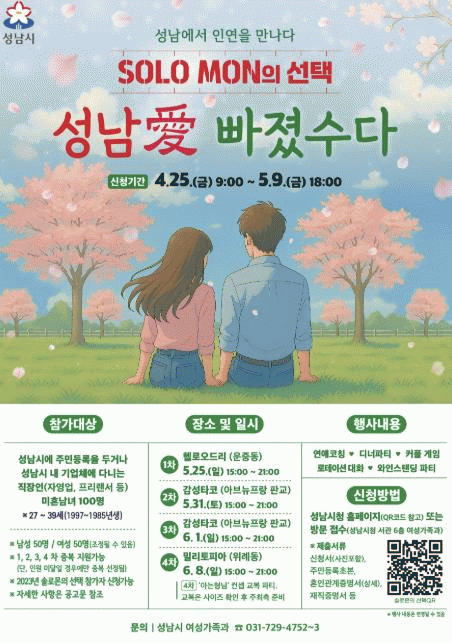 [NWS¹æ¼Û=Çѽ¸ñ ±âÀÚ]¼º³²½Ã´Â ¿À´Â 4¿ù 25ÀϺÎÅÍ 5¿ù 9ÀϱîÁö ¡®¼Ö·Î¸ó(SOLO MON)ÀÇ ¼±Åᯠ¿ÃÇØ »ó¹Ý±â Çà»ç Âü°¡ÀÚ 400¸í(³²¡¤¿© °¢ 200¸í) ¸ðÁýÇÑ´Ù. 3³â Â÷ÀÎ ÀÌ Çà»ç´Â ¹ÌÈ¥ ûÃá ³²³àÀÇ ¸¸³²À» ÁÖ¼±ÇÏ´Â ÀÚ¸®·Î, ½Ã´Â ¿ÃÇØ °èȹ¡¦