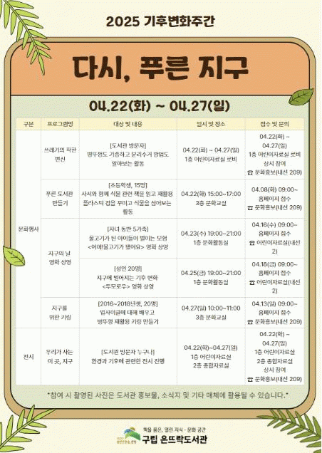 [»çȸ] '´Ù½Ã, Ǫ¸¥ Áö±¸' ÀºÆò±¸, Àº¶ß¶ôµµ¼­°ü¿¡¼­ ±âÈĺ¯È­ ÁÖ°£ ¹®È­Çà»ç ÁøÇà |2025. 04.22