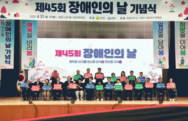 [NWS¹æ¼Û=Çѽ¸ñ ±âÀÚ]Àü¶ó³²µµÀÇȸ ±èÅÂ±Õ ÀÇÀåÀº 4¿ù 21ÀÏ ¿µ±¤½ºÆ÷Ƽ¿ò±¹¹ÎüÀ°¼¾ÅÍ¿¡¼­ ¿­¸° ¡®Á¦45ȸ Àå¾ÖÀÎÀÇ ³¯¡¯ ±â³äÇà»ç¿¡ Âü¼®Çß´Ù. À̳¯ ±â³äÇà»ç¿¡´Â ±è¿µ·Ï Áö»ç¿Í ±¹È¸ÀÇ¿ø, Àå¾ÖÀδÜüÀå, µµ¹Î µî 2,000¿© ¸íÀÌ Âü¼®ÇÑ ¡¦