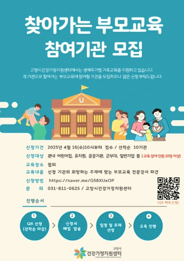 [»çȸ] °í¾ç½Ã °Ç°­°¡Á¤Áö¿ø¼¾ÅÍ, ¡®Ã£¾Æ°¡´Â ºÎ¸ð±³À°¡¯ Âü¿©±â°ü ¸ðÁý |2025. 04.21