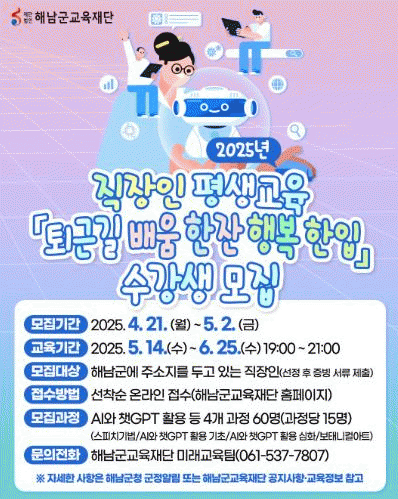 [NWS¹æ¼Û=Çѽ¸ñ ±âÀÚ]ÇØ³²±º ±³À°Àç´ÜÀº Á÷ÀåÀÎ Æò»ý±³À° ÇÁ·Î±×·¥¡®Åð±Ù±æ ¹è¿ò ÇÑÀÜ Çູ ÇÑÀÔ¡¯À» ¿î¿µÇÑ´Ù. ¡®Åð±Ù±æ ¹è¿ò ÇÑÀÜ Çູ ÇÑÀÔ¡¯Àº ÆòÀÏ ³· ±³À°ÇÁ·Î±×·¥¿¡ Âü¿©Çϱ⠾î·Á¿î Á÷ÀåÀεéÀ» À§ÇØ Àú³á 7½ÃºÎÅÍ 9½Ã±îÁö ¾ß°£¡¦