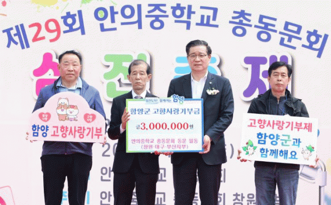 [NWS¹æ¼Û=Çѽ¸ñ ±âÀÚ]ÇÔ¾ç ¾ÈÀÇÁßÇб³ Ãѵ¿¹®È¸´Â Áö³­ 4¿ù 19ÀÏ ¿ÀÀü, ¾ÈÀÇÁßÇб³ ¿îµ¿Àå¿¡¼­ ¿­¸° ¡®Á¦29ȸ Ãѵ¿¹®È¸(½ÉÁøÃàÁ¦)¡¯ °³È¸½Ä¿¡¼­ °íÇâ ÇÔ¾çÀÇ ¹ßÀüÀ» ¿°¿øÇÏ¸ç °íÇâ»ç¶û±âºÎ±Ý 300¸¸ ¿øÀ» ±âŹÇß´Ù. À̹ø ±âºÎ´Â â¿ø¡¤¡¦