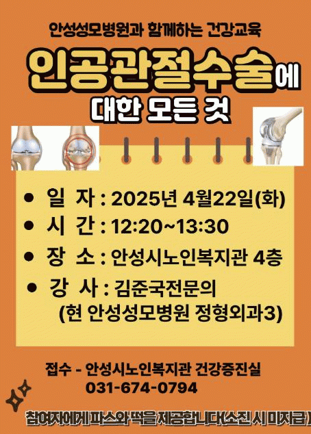 [NWS¹æ¼Û=Çѽ¸ñ ±âÀÚ]¾È¼º½Ã³ëÀκ¹Áö°üÀº ¾È¼º¼º¸ðº´¿ø°ú ÇÔ²² ¡®Àΰø°üÀý¼ö¼ú¿¡ ´ëÇÑ ¸ðµç °Í¡¯À» ÁÖÁ¦·Î °Ç°­±³À° Âü¿©ÀÚ¸¦ ¸ðÁýÇÑ´Ù°í ¹àÇû´Ù. À̹ø ±³À°Àº °Ç°­ÁõÁø Áö¿ø»ç¾÷ÀÇ ÀÏȯÀ¸·Î Àΰø°üÀý ¼ö¼ú(¹«¸­, ¾î±ú) ½Ã ²À ¾Ë¾Æ¾ß ÇÒ¡¦