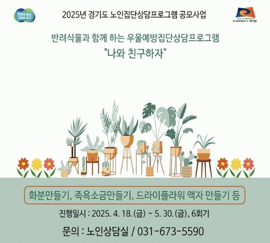 [NWS¹æ¼Û=Çѽ¸ñ ±âÀÚ]¾È¼º½Ã³ëÀκ¹Áö°üÀº 2025³â °æ±âµµ³ëÀÎÁ¾ÇÕ»ó´ã¼¾ÅÍ ³ëÀοì¿ï¿¹¹æ Áý´Ü»ó´ã Áö¿øÇÁ·Î±×·¥¿¡ ¼±Á¤µÅ 4¿ù 18ÀϺÎÅÍ 5¿ù 30ÀϱîÁö ³ë³â±â ¿ì¿ï¿¹¹æÀ» À§ÇÑ ¡®³ª¿Í Ä£±¸ÇÏÀÚ¡¯ Áý´Ü»ó´ãÀ» ÁøÇàÇÑ´Ù°í 17ÀÏ ¹àÇû´Ù. ¡®³ª¡¦