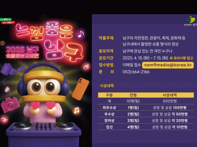 [NWS¹æ¼Û=Çѽ¸ñ ±âÀÚ]´ë±¸ ³²±¸Ã»ÀÌ ³²±¸ÀÇ ´Ùä·Î¿î ¸Å·ÂÀ» ³Î¸® ¾Ë¸®±â À§ÇØ ¡®´À³¦ÁÁÀº ³²±¸¡¯¶ó´Â ÁÖÁ¦·Î ¼ôÆû ¿µ»ó °ø¸ðÀüÀ» °³ÃÖÇÑ´Ù. À̹ø °ø¸ðÀüÀº Áö¿ª ÁÖ¹ÎÀº ¹°·Ð °ü±¤°´µé¿¡°Ôµµ »ç¶û¹Þ´Â ³²±¸ÀÇ ÀÚ¿¬°æ°ü, ¹®È­À¯»ê, ¡¦