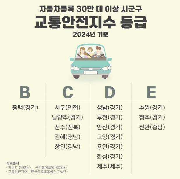 [NWS¹æ¼Û=Çѽ¸ñ ±âÀÚ]ÀÚµ¿Â÷µî·Ï 30¸¸ ´ë ÀÌ»ó ½Ã±º±¸ Áß ÆòÅýÃÀÇ ±³Åë¾ÈÀüÁö¼ö µî±ÞÀÌ °¡Àå ³ôÀº °ÍÀ¸·Î ³ªÅ¸³µ´Ù. ±³Åë¾ÈÀüÁö¼ö´Â µµ·Î±³Åë°ø´ÜÀÌ ¸Å³â ±³Åë»ç°í ºòµ¥ÀÌÅ͸¦ ±â¹ÝÀ¸·Î »êÁ¤ÇÏ´Â ÁöÇ¥·Î, ¡â»ç¾÷¿ë ÀÚµ¿Â÷ ¡âÀÚÀü°Å?ÀÌ¡¦