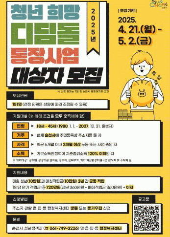 [NWS¹æ¼Û=Çѽ¸ñ ±âÀÚ]¼øÃµ½Ã´Â 2025³â ¡®Ã»³â Èñ¸Áµðµõµ¹ ÅëÀå»ç¾÷¡¯ ½Å±Ô´ë»óÀÚ¸¦ 4¿ù 21ÀϺÎÅÍ 5¿ù 2ÀϱîÁö 2ÁÖ°£ ¸ðÁýÇÑ´Ù. û³â Èñ¸Áµðµõµ¹ ÅëÀå»ç¾÷Àº û³âÀÌ ¿ù 10¸¸¿øÀ» Àû¸³ÇÏ¸é ¼øÃµ½Ã¿¡¼­ 10¸¸¿øÀ» 36°³¿ù µ¿¾È ¸ÅĪ Àû¸³ÇÏ¿©¡¦
