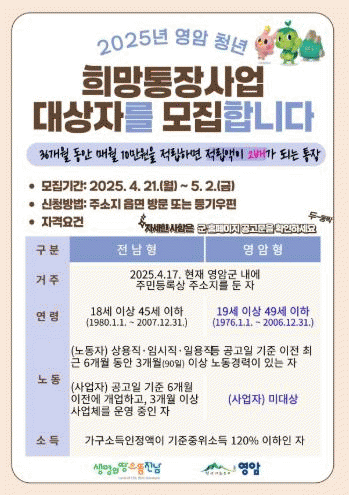 [NWS¹æ¼Û=ÇãÀº¼­ ±âÀÚ]¿µ¾Ï±ºÀÌ 4/21~5/2ÀÏ ¡®2025³â ¿µ¾Ï±º û³â Èñ¸Á µðµõµ¹ ÅëÀå»ç¾÷¡¯ Âü¿©ÀÚ¸¦ ¸ðÁýÇÑ´Ù. Áö¿ª¿¡¼­ ÀÏÇϴ û³âµéÀÇ ÀÚ»ê Çü¼ºÀ» Áö¿øÇÏ´Â ÀÌ »ç¾÷Àº, û³âÀÌ ¸Å¿ù 10¸¸¿øÀ» Àû¸³Çϸé, ¿µ¾Ï±ºÀÌ ¿©±â¿¡ 10¸¸¿øÀ» ´õ¡¦