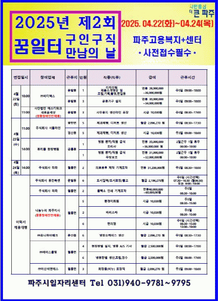 [NWS¹æ¼Û=Çѽ¸ñ ±âÀÚ]ÆÄÁֽô ¿À´Â 4¿ù 22ÀϺÎÅÍ 24ÀϱîÁö ÆÄÁÖ°í¿ëº¹ÁöÇ÷¯½º¼¾ÅÍ(±ÝÃ̵¿ MHŸ¿ö 8Ãþ)¿¡¼­ 2025³â Á¦2ȸ ¡®±¸ÀΡ¤±¸Á÷ ¸¸³²ÀÇ ³¯¡¯À» °³ÃÖÇÑ´Ù°í ¹àÇû´Ù. À̹ø Çà»ç¿¡´Â 11°³ ±â¾÷ÀÌ Âü¿©Çϸç, ÆÄÁֽà ÀÏÀÚ¸®¼¾ÅÍ´Â Ã롦