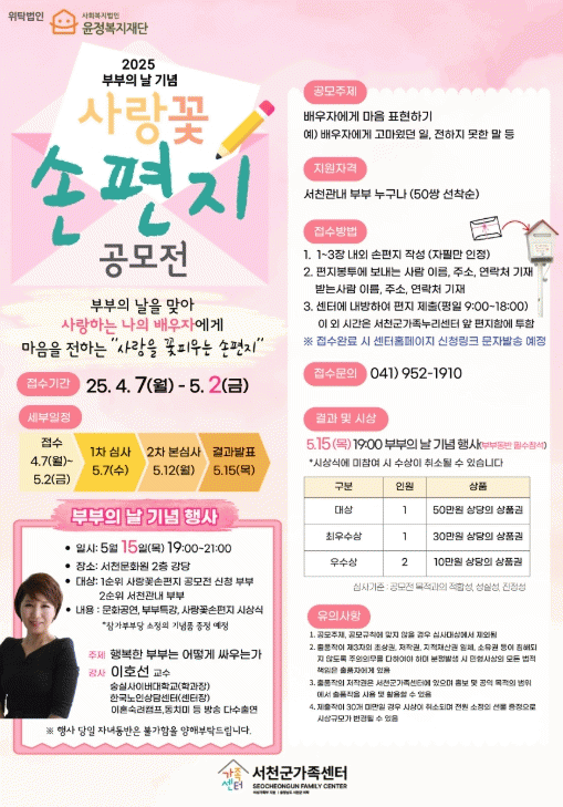 [NWS¹æ¼Û=Çѽ¸ñ ±âÀÚ]¼­Ãµ±º°¡Á·¼¾ÅÍ´Â ¿À´Â 5¿ù 21ÀÏ ¡®ºÎºÎÀÇ ³¯¡¯À» ±â³äÇØ ºÎºÎ °£ »ç¶û°ú °¨»çÀÇ ¸¶À½À» ³ª´©´Â ¡®2025 »ç¶û²É ¼ÕÆíÁö °ø¸ðÀü¡¯À» °³ÃÖÇÑ´Ù. À̹ø °ø¸ðÀüÀº ºÎºÎ°ü°è ÁõÁøÀ» ¸ñÀûÀ¸·Î ¸¶·ÃµÆÀ¸¸ç, ¼­Ãµ±º¿¡ ÁÖ¼Ò¸¦¡¦