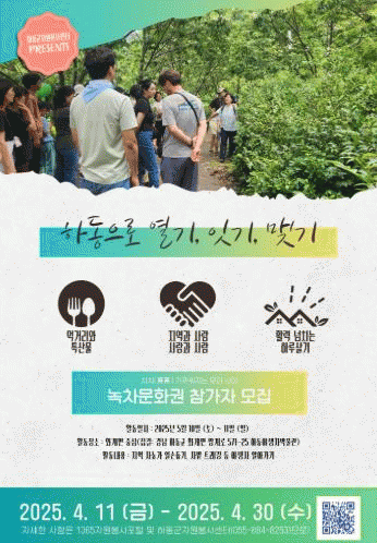 [NWS¹æ¼Û=Çѽ¸ñ ±âÀÚ] Çϵ¿±ºÀÚ¿øºÀ»ç¼¾ÅͰ¡ ¿À´Â 30ÀϱîÁö Áö¿ªÈ°·Â ½ºÄÉÀϾ÷(Scale-up) ÇÁ·ÎÁ§Æ®ÀÇ ÀÏȯÀ¸·Î ¡®Çϵ¿À¸·Î ¿­±â, ÀÕ±â, ¸Î±â¡¯ ³ìÂ÷¹®È­±Ç Âü°¡ÀÚ¸¦ ¸ðÁýÇÑ´Ù. Çѱ¹Áß¾ÓÀÚ¿øºÀ»ç¼¾ÅÍ¿¡¼­ ÁÖ°üÇÏ´Â À̹ø ÇÁ·Î±×·¥Àº ÀΡ¦