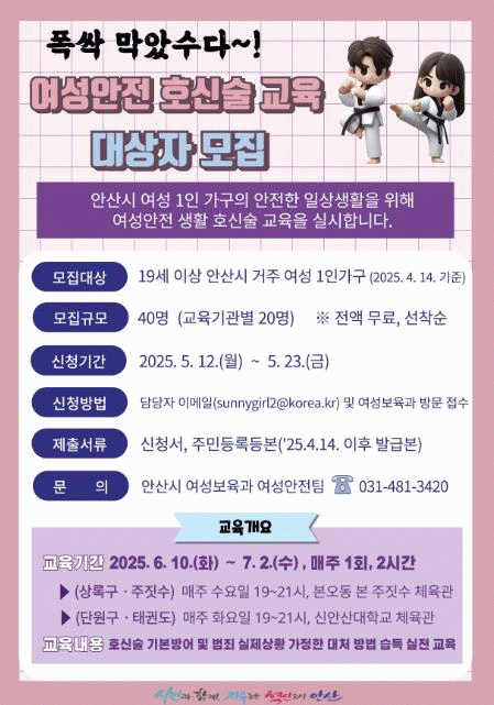 [»çȸ] ¾È»ê½Ã, ¿©¼º ¾ÈÀüÀ» À§ÇÑ '»ýȰ È£½Å¼ú ±³À°' Âü¿©ÀÚ ¸ðÁý |2025. 04.21