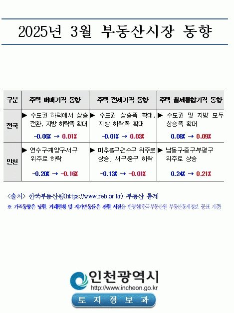 [NWS¹æ¼Û=Çѽ¸ñ ±âÀÚ]ÀÎõ±¤¿ª½Ã´Â 2025³â 3¿ù ÁÖÅà ¸Å¸Å°¡°Ý°ú Àü¼¼°¡°ÝÀÌ µ¿¹Ý Ç϶ôÇßÀ¸³ª, Ç϶ôÆøÀº 3°³¿ù ¿¬¼Ó ÁÙ¾ú´Ù°í ¹àÇû´Ù. ÀÎõ½Ã°¡ Çѱ¹ºÎµ¿»ê¿øÀÇ ºÎµ¿»ê Åë°èÁ¤º¸¸¦ ºÐ¼®ÇØ ¹ßÇ¥ÇÑ ¡®2025³â 3¿ù ºÎµ¿»ê½ÃÀå µ¿Çâ º¸°í¼­¡¯¡¦