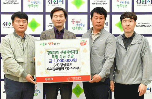 [NWS¹æ¼Û=Çѽ¸ñ ±âÀÚ](»ç)°æ»óºÏµµ ¿Á¿Ü±¤°íÇùȸ °æ»ê½ÃÁöºÎ´Â 18ÀÏ °æ»ê½ÃûÀ» ¹æ¹®ÇÏ¿© ÃÖ±Ù »êºÒ·Î »îÀÇ ÅÍÀüÀ» ÀÒ°í ¾î·Á¿òÀ» °Þ°í ÀÖ´Â ÀÌ¿ôµéÀ» µ½±â À§ÇØ ¼º±Ý 100¸¸¿øÀ» ±âŹÇß´Ù. ¿øÀ±Èñ ÁöºÎÀåÀº¡°»êºÒ ÇÇÇØ·Î Èûµç ½Ã±â¸¦ °Þ¡¦