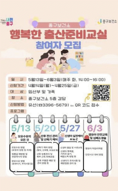 [NWS¹æ¼Û=Çѽ¸ñ ±âÀÚ]¼­¿ï Áß±¸°¡ 5¿ù 13ÀϺÎÅÍ 6¿ù 3ÀϱîÁö ¸ÅÁÖ È­¿äÀϸ¶´Ù ÃÑ 4ȸ¿¡ °ÉÃÄ Áß±¸º¸°Ç¼Ò 5Ãþ °­´ç¿¡¼­ 'ÇູÇÑ Ãâ»êÁغñ±³½Ç'À» ¿î¿µÇϸç Âü¿©ÀÚ¸¦ ¸ðÁýÇÑ´Ù. °ü³» ÀÓ»êºÎ ¹× °¡Á·À» ´ë»óÀ¸·Î °Ç°­ÇÏ°í ¾ÈÀüÇÑ Ãâ»êÁغñ¡¦